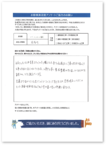 社長をはじめ、営業スタッフや職人の対応について「礼儀正しく丁寧で安心できた」と感じていただけたこと、また仕上がりにもご満足いただけたとのこと、スタッフ一同大変嬉しく思っております。