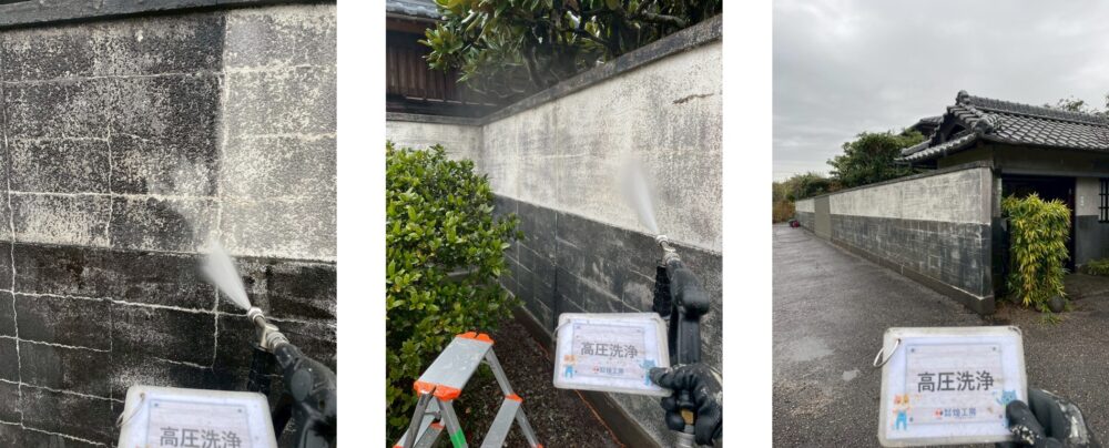 ブロック塀表面に付着したホコリ・汚れ・藻などをしっかりと洗い流し、