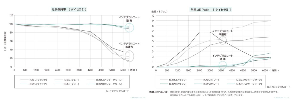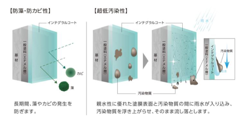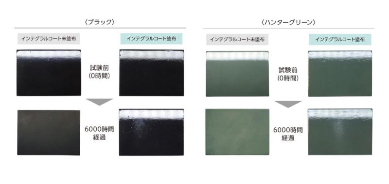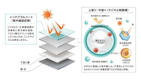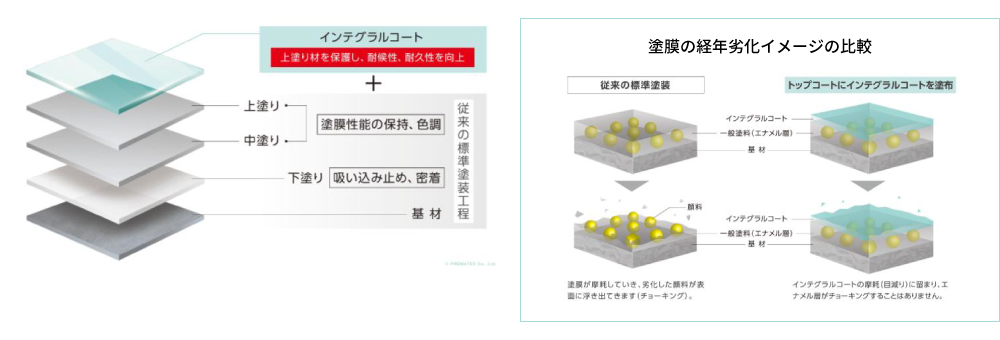 自動車の塗装工程のように、トップコートにインテグラルコートを塗布することで上塗材を長期的に保護、塗膜の耐候性、耐候性を高め、期待耐用年数の延長を可能にします。