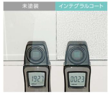 ガラス面右半分にインテグラルコートを塗布し、屋外で紫外線強度を測定した結果、塗布していない左面に対し、インテグラルコートは高い紫外線透過抑制効果を発揮していることが確認できます。
