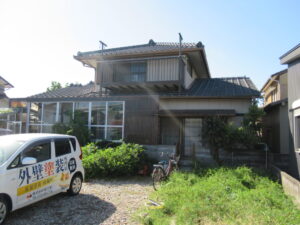 外壁には色あせや細かなひび割れが見られ、屋根も全体的に劣化が進んでいる状態でした。