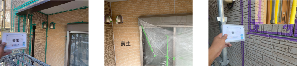 ひび割れや表面塗膜剥離を補修し、塗装しない部分を丁寧に養生しました。