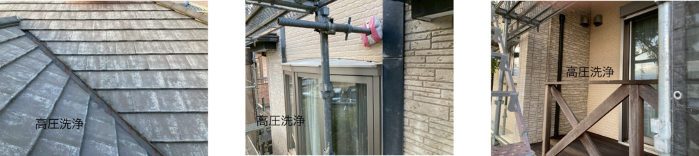 長年の汚れやカビ・コケを高圧洗浄で除去し、塗料の密着性を高めます。