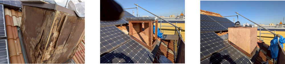 ダミー煙突は劣化が激しく、下地補強後にガルバ外壁で貼り替え。
